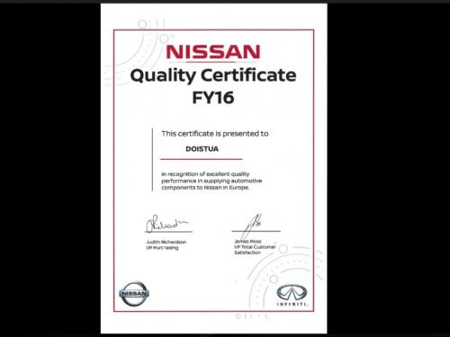EL pasado 13 de Septiembre, Doistua fue galardonado con el Certificado de Calidad de Nissan FY16 en reconocimiento a su excelente desempeño suministrando componentes de automoción a Nissan Europa.